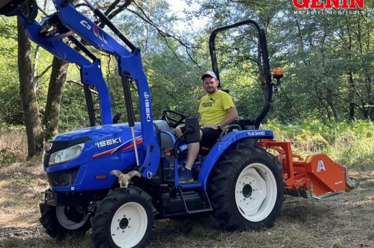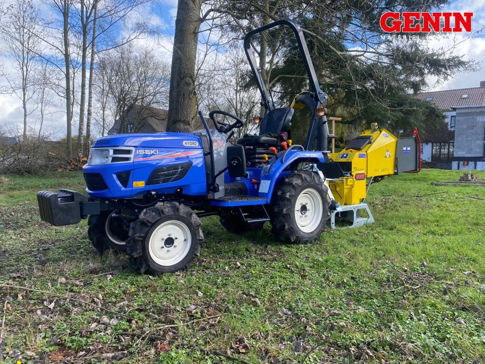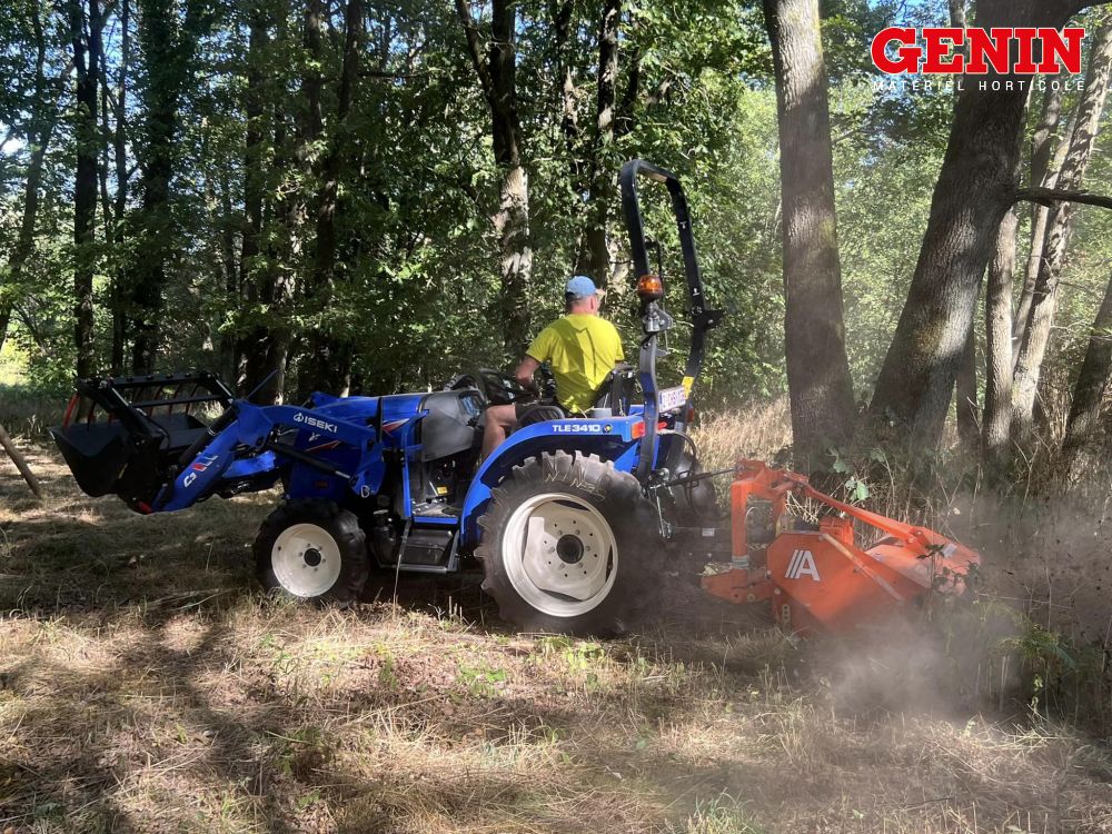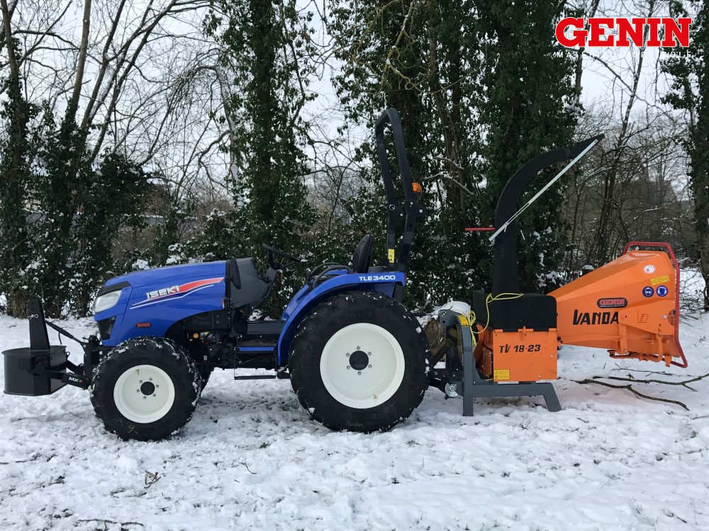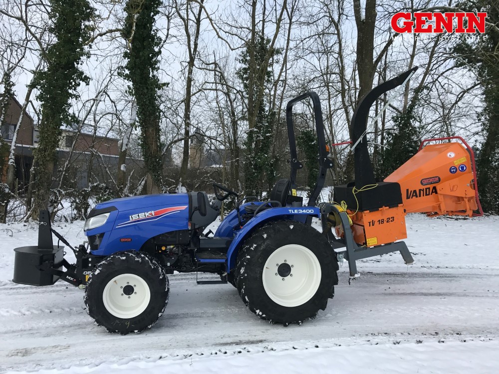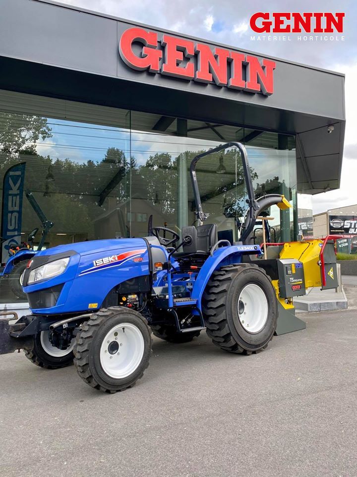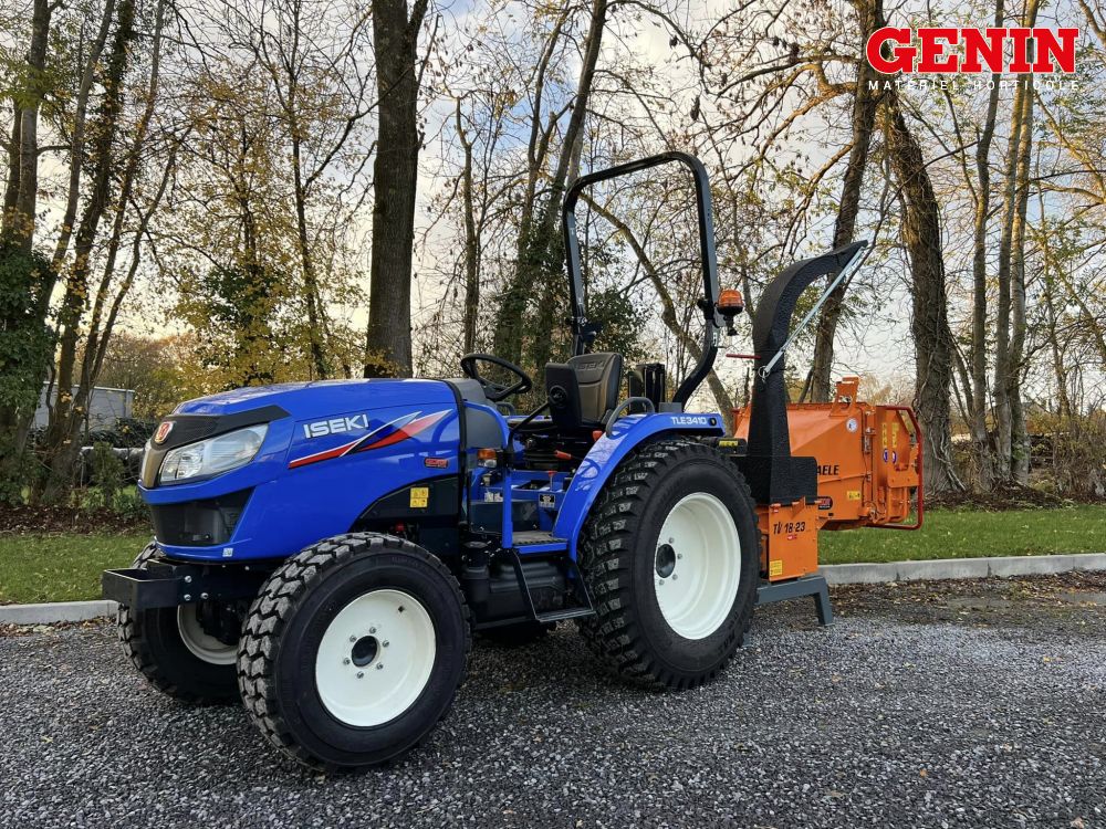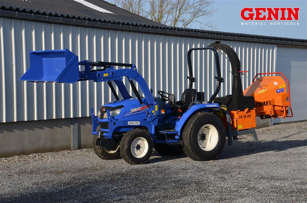 Une présentation de l'Iseki TLE 3400 monté avec des roues agraires large et un broyeur de branche Vandaele TV 18-23
