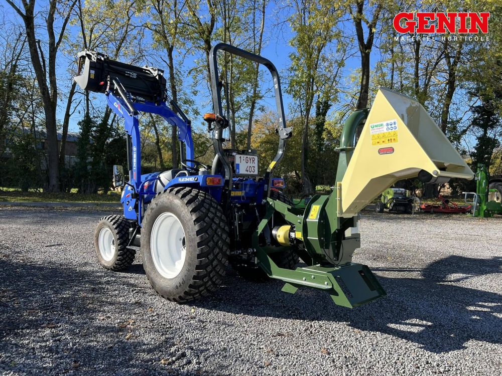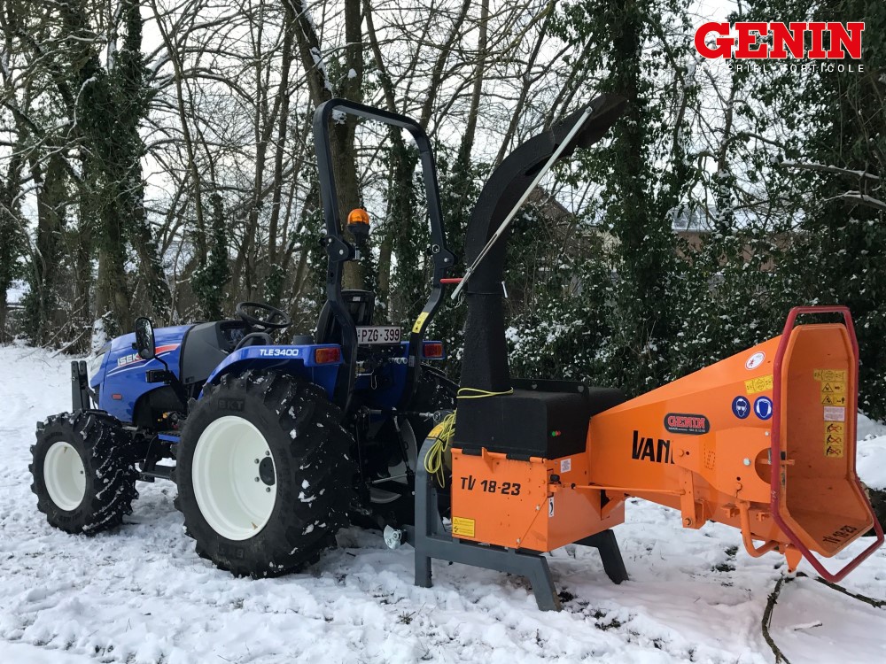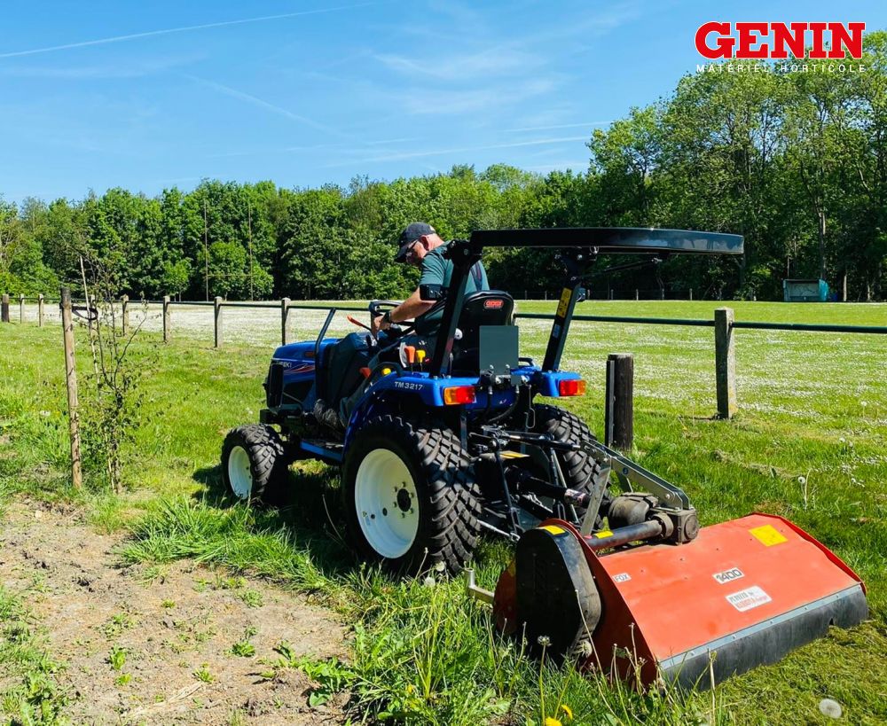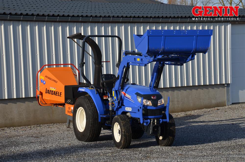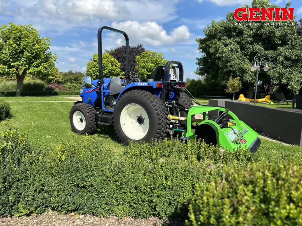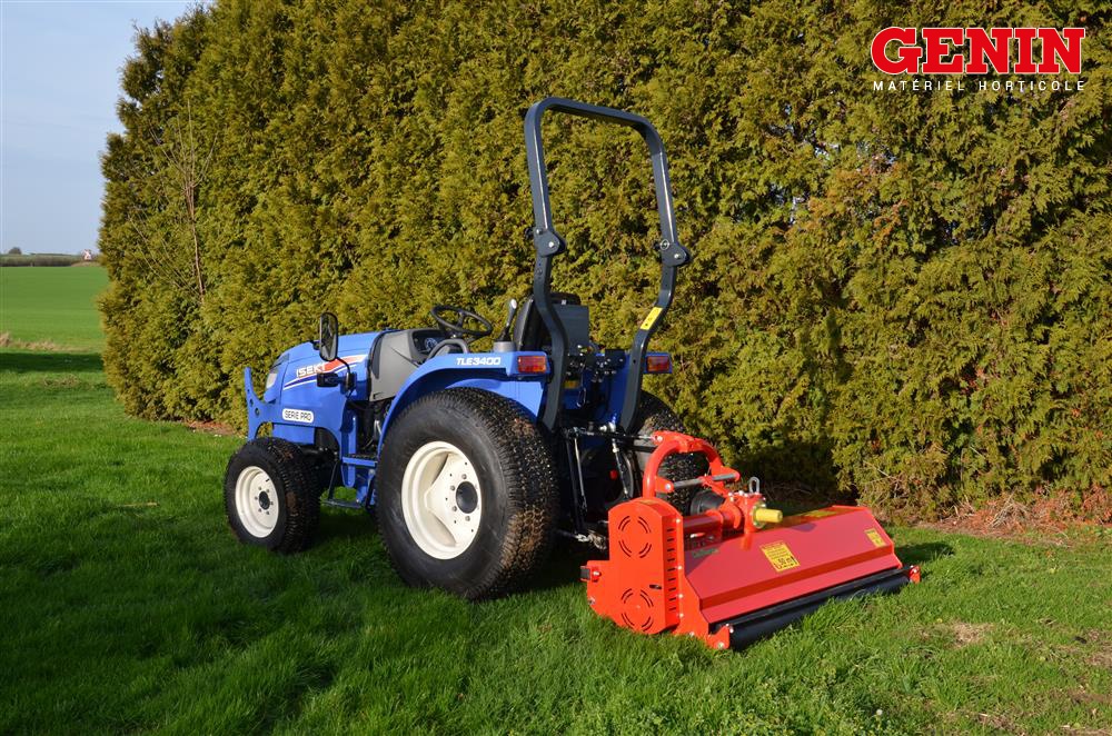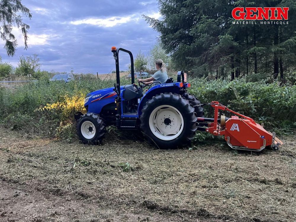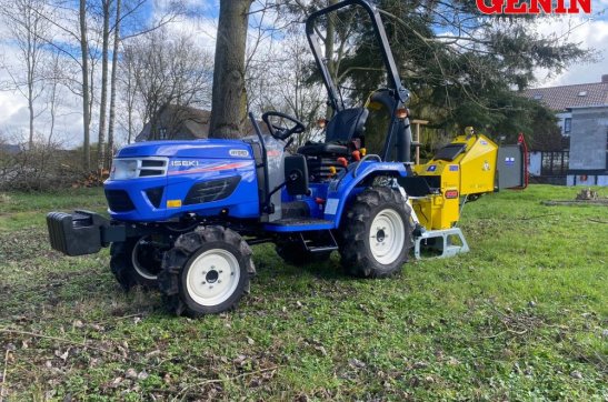 Une présentation de l'Iseki TLE 3400 monté avec des roues agraires large et un broyeur de branche Vandaele TV 18-23