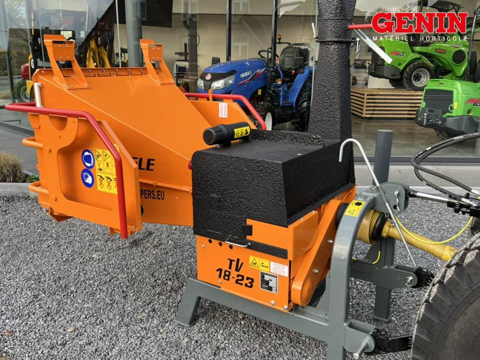 Moteur 23cv, Entraîneur hydraulique avec anti-stress, Transmission hydraulique sur chenilles, Chambre de broyage 24 couteaux, Diamètre max admissible 130mm, Éclairage de travail, Largeur 89cm, Poids 506 Kg